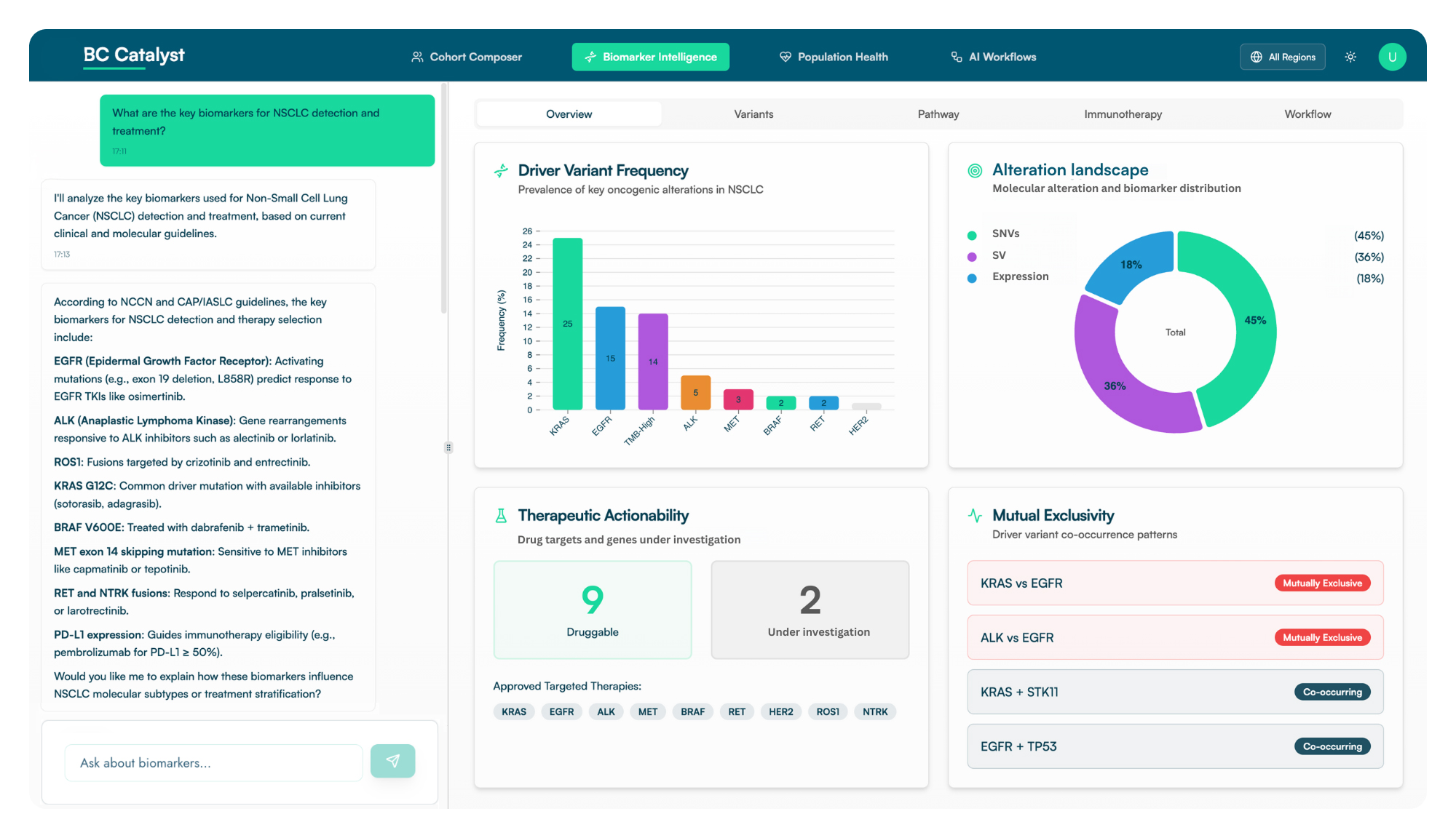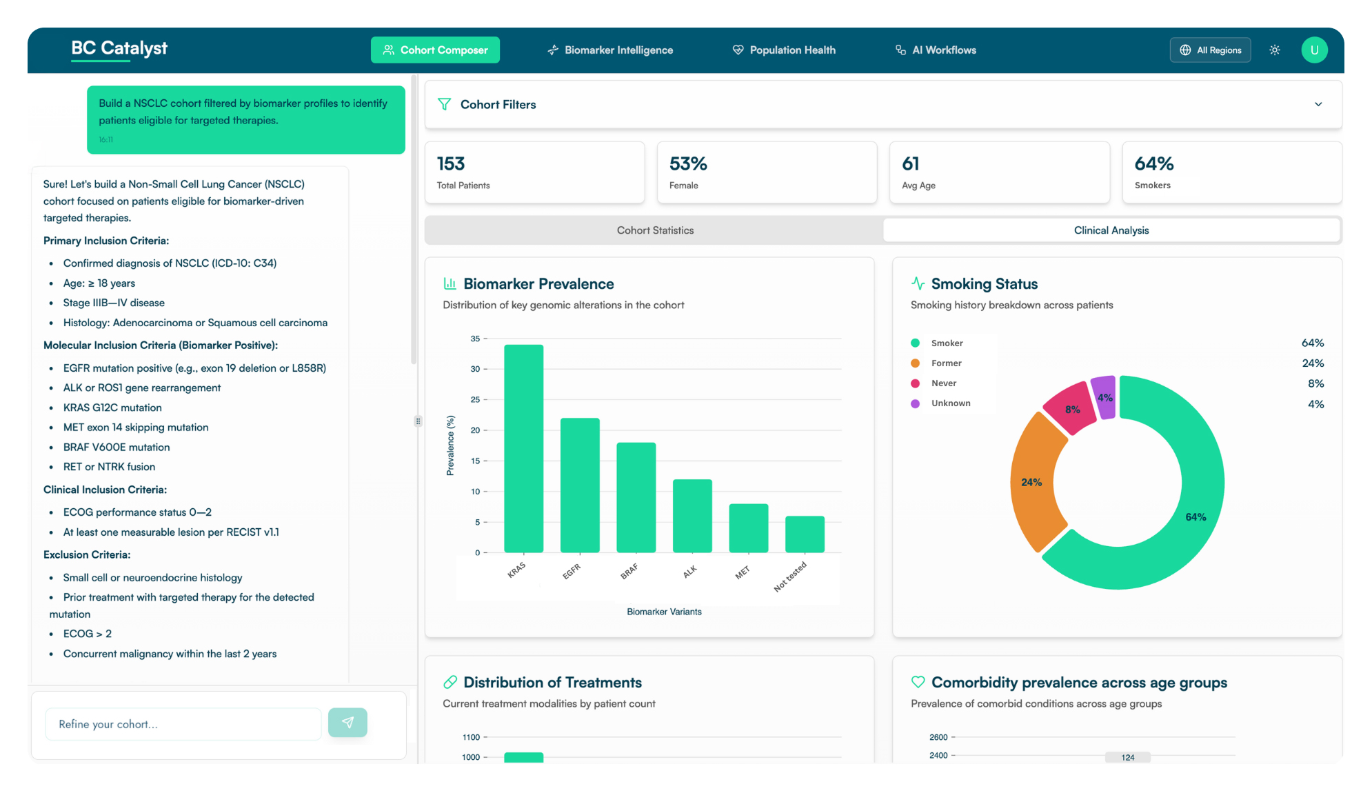 Accelerate your research with BC Catalyst โ€“ an intuitive SaaS-based platform featuring prompt-based cohort building, biomarker discovery, and standard of care insights. By combining genomic, clinical, real-world data, and inputs from other public sources in an agentic AI model that continues to learn and grow, BC Catalyst fuels precision medicine strategy, market access, and evidence generation.