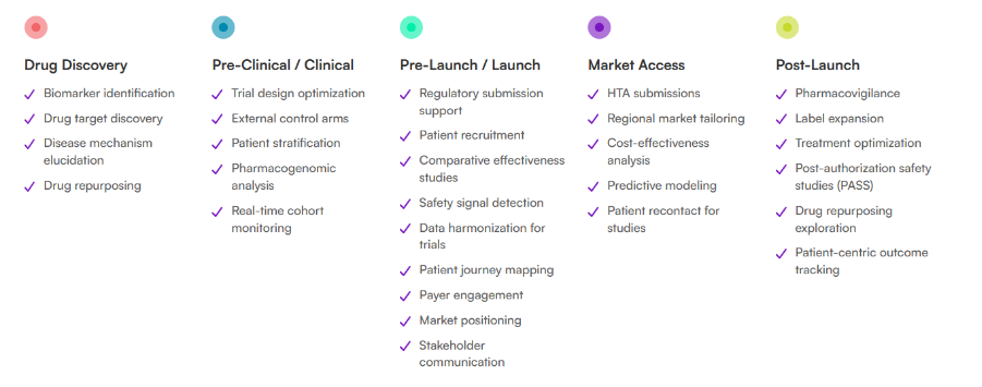 The platform accelerates decision-making across the full drug lifecycle, supporting discovery, feasibility, biomarker exploration, treatment outcomes and market uptake, and post-market questions.